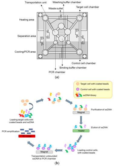 (a) Schematic representation of the magnetic-bead-based microfluidic chip used in microfluidic-based cell-SELEX procedure; (b) Fundamental steps of the procedure. Aptamers are mixed with magnetic beads-coated target cells (positive selection) and the magnetic-bead complexes are recovered by applying a magnetic field. Bound ssDNAs are then mixed with magnetic beads-coated control cells (negative selection). Control cells–aptamer complexes are collected and the supernatant are transported to the PCR chamber for amplification.