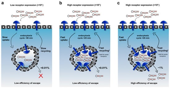 Relationships among three key factors that govern cytosolic delivery: receptor expression on the cell surface, rate of endocytosis and endosomal escape efficiency of cargoes. In (a,b) the estimated efficiency of escape is <0.01% per cycle of endocytosis; (a) Upon binding to low-expressed receptors (<104 copies/cell) that internalize with slow rate of uptake (~90 min), a negligible cytoplasmic translocation of internalized aptamers occurs; (b) Increased translocation can be observed when cell targeting aptamers bind highly expressed receptors (>105 copies/cell) that show faster internalization (~20 min). This situation can, in some extent, resemble some successful cancer therapy strategies aim to target asialoglycoprotein receptor (ASGPR), which is expressed at high levels on the surface of liver cells (c) An ideal delivery system should bind highly expressed receptors (>105) with high rate of uptake (~20 min) and should possess an enhanced endosomal escape efficiency (i.e., high efficiency of cargoes ~1%/cycle).