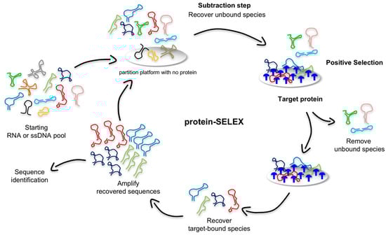Schematic illustration of the protein-based SELEX. In a typical protocol, a subtractive step is first performed to remove nucleic acid sequences with significant affinity toward the partition platform used during the SELEX (e.g., beads, nitrocellulose filter, or chip-based approaches). The recovered unbound sequences are then incubated with the target protein (depicted in blue), and target-bound ligands are separated from the unbound population, recovered and amplified for the next SELEX round.