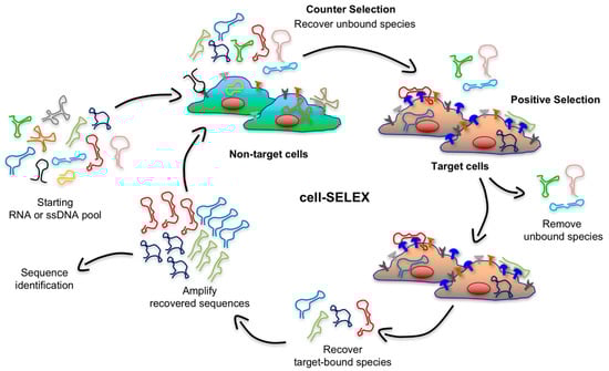 Although, most cell targeting aptamers have been generated using protein-based selections, recombinant purified proteins may not fold into the correct 3D structure that is formed under physiologic conditions []. In most cases, only the extracellular domain of a cell-surface receptor is used as target during the selection and the absence of a transmembrane domain may alter the overall 3D conformation. Moreover, recombinant proteins are generated through in vitro expression systems, which often do not include the presence of post-translational modifications. Additionally, in some cases cell-surface proteins are insoluble in their recombinant forms, require interactions with other cell components (e.g., G protein-coupled receptor), or form multimeric and/or multivalent structures []. Thus, RNA and DNA aptamers selected through a protein-based SELEX approach might not be able to recognize the same target when embedded in a physiological milieu. For instance, the Sullenger group selected RNA aptamers against the histidine-tagged epidermal growth factor receptor (EGFR)vIII ectodomain []. This recombinant protein was expressed and purified using an Escherichia coli system, which lacks post-translational modifications. Selected aptamers were not able to bind the same protein when it was expressed in eukaryotic cells, which the authors concluded is due to the lack of one specific post-translation modification (i.e., glycosylation), significantly altering the structure of the target protein []. Live cell-based SELEX (or cell-SELEX) overcomes these limitations by using whole living cells as the selection target so that surface antigens are displayed in a more native environment (Figure 3). In contrast to the protein-based SELEX, cell-SELEX does not need information regarding native conformation or biological function of target proteins, and aptamers can even be generated against unknown cell-surface antigens. This method relies on the difference between the expression pattern of cell-surface receptors in target cell population (e.g., cancer cells) and the receptor pattern in control cell line (e.g., healthy cells) []. Thereby, a counter selection (or subtractive selection) is implemented in early rounds of the cell-SELEX to exclude sequences that have an affinity for components present on the surface of both target and non-target cells. As shown in Figure 3, during this subtractive step, the library is incubated with a control cell line and the unbound sequences are recovered and subsequently incubated with target cells.