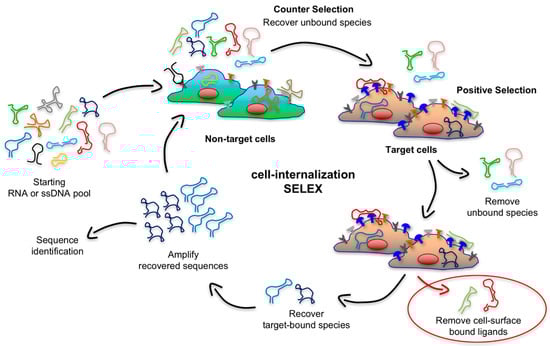 Schematic illustration of the cell-internalization SELEX. This modified selection protocol aims at selecting nucleic acid ligands that are able to both bind cell-surface antigens (depicted in blue) and their ability to rapidly internalize into the cell under physiological conditions, while effectively eliminating aptamers that lack internalizing ability and aptamers that only slowly internalize into the cells because of the target they bind.