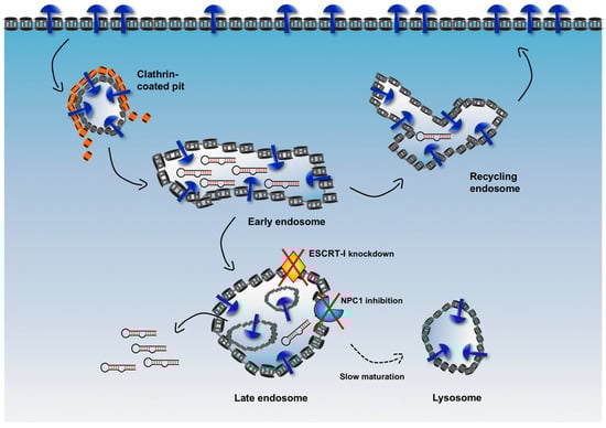 To increase the efficiency of endosomal escape, emerging strategies aim to delay endosome maturation of non-recycling vesicles, thus increasing retention of cargoes in these vesicles and avoiding fast degradation in lysosomes []. For example, the endosomal sorting complex required for transport-I (ESCRT-I) plays a critical role in the maturation and trafficking of endosomal cargoes, and, when ESCRT-I is associated with other accessory proteins, it is involved in the generation of particular late endosomes, i.e. multivesicular bodies (MVBs). By knocking down two components of ESCRT-I (i.e., TSG101 and VPS28), Wagenaar et al. observed that delivered antagomiR able to downregulate the oncogenic miRNA-21 displayed increased cytotoxic effect and tumor regression in vivo [].