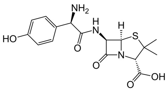 Antibiotics of an anthropogenic origin have recently been shown to induce a variety of morphological and transcriptional changes in bacteria. These changes include increased virulence, altered gene transcription profiles, amplified horizontal gene transfer, and robust biofilm formation [6,7,8,9,10]. Amox (Figure 1), a β-lactam, was specifically selected for investigation because it is commonly prescribed within healthcare settings and is widely used in agriculture. According to a 2015 report by The Center for Disease Dynamics, Economics, and Policy group, the US is the world’s third largest consumer of healthcare antibiotics at 10,000 standard units (SUs), prescribed in 2010 [11]. Amox is one of the most commonly prescribed antibiotics on the market; in 2013, of the 48 million antibiotics prescribed, 6.7 million prescriptions contained Amox [11,12]. In addition to being widely utilized within healthcare settings, recent findings demonstrate that approximately 80–90% of an antibiotic dose is excreted in parent form, post consumption [13,14].
