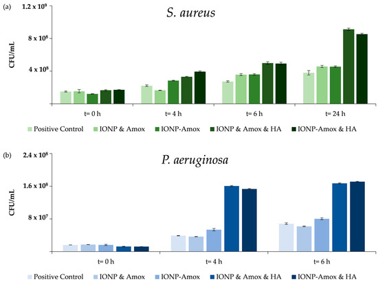 (a) S. aureus CFU/mL control condition values for time points 0, 4, 6, & 24 h. Error bars indicate ± SD; (b) P. aeruginosa CFU/mL control condition values for time points 0, 4, & 6 h. Error bars indicate ± SD. Both graphs indicating similar effects of IONP-Amox/IONP & Amox, and IONP-Amox & HA/IONP & Amox & HA (functionalized vs. unfunctionalized) on bacterial growth.