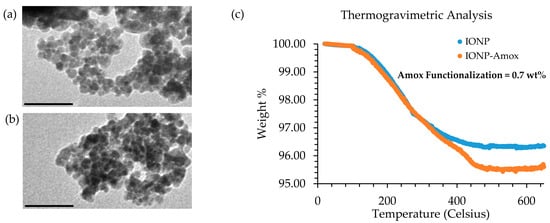 TG analysis was performed to confirm Amox functionalization of the IONP surface, as shown in Figure 3c. Approximately 1 mg of dried IONP and IONP-Amox was placed in a palladium pan and heated to 650 °C under N2. TG analysis of IONP-Amox was carried out to confirm Amox functionalization and to ensure stability [33]. Because Amox was present during IONP synthesis, the IONP & IONP-Amox curves overlap at lower temperatures, only at higher temperatures do differences become apparent, indicating that Amox is not removed easily.