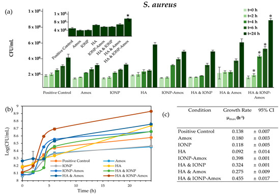 (a) S. aureus CFU/mL values for time points 0, 2, 4, 6, & 24 h. Error bars indicate ± SD, asterisk indicates statistical distinction (α = 0.05) from all other conditions at respective time points. Data indicated by an asterisk statistically differ from all other data within the respective time set; other statistical differences are described in the narrative. Inset graph represents t = 24 h; (b) S. aureus growth profiles. Error bars indicate ± SD; (c) S. aureus maximum μmax (h−1). 95% Confidence Intervals are indicated.