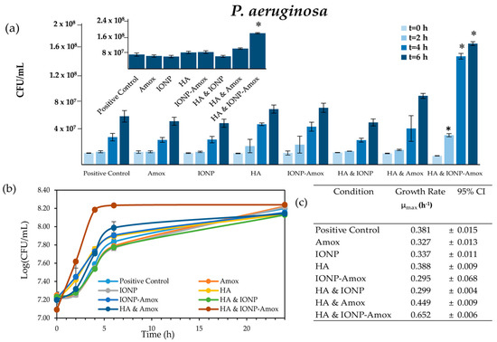 S. aureus & P. aeruginosa growth increased when exposed to IONP-Amox. Bacterial concentrations observed in S. aureus conditions (t = 4, 6 & 24 h) exceeded (p < 0.05) those in cultures exposed to Amox or IONP alone, see Figure 4a. Similarly, when exposed to IONP-Amox bacterial concentrations observed in P. aeruginosa conditions (t = 4 & 6 h), they exceeded (p < 0.05) those observed in cultures with only IONP or Amox, see Figure 5a. The μmax for IONP-Amox conditions, in both S. aureus and P. aeruginosa, also exceeded respective control conditions (p < 0.05), see Figure 4c and Figure 5c.