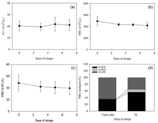 Figure 1. (ac) Stable counts of platelets, red blood cells (RBCs), and white blood cells (WBCs) in stored whole blood samples (n = 8); (d) A comparison of WBC components between fresh and 7-day-stored WB samples. The data were calculated from an average of 8 samples. W-SCR: WBC small cell ratio, W-MCR: WBC middle cell ratio, W-LCR: WBC large cell ratio.