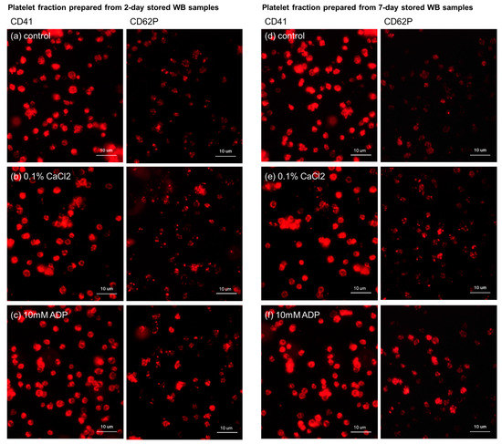 Figure 2. Immunofluorescent staining of CD41 and CD62P expressed in platelets isolated from 2-day- or 7-day-stored WB samples. (a,d) Control resting platelets; (b,e) platelets stimulated by 0.1% CaCl2 for 15 min; and (c,f) platelets stimulated by 10 mM ADP for 15 min. The platelets were derived from the same donor and were distributed with almost the same density in all the dishes (views).