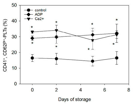Figure 3. Flow-Cytometric (FCM) analysis of CD41- and CD62P-double-positive platelets in platelet fractions that were prepared from fresh or stored WB samples and stimulated with 10 mM ADP or 0.1% CaCl2 for 15 min (n = 4). * p < 0.05 as compared with control platelets at the same time points. No significant differences were observed in time-course changes.