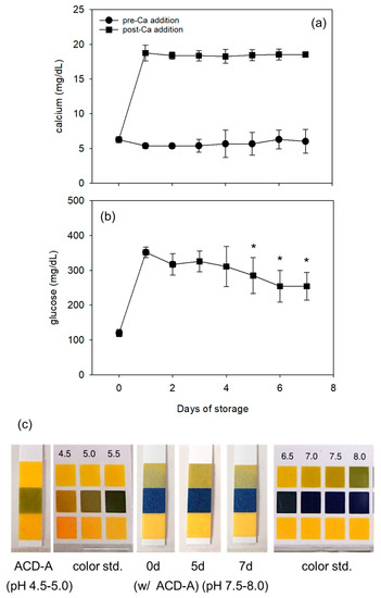In the liquid fraction of WB samples, Ca2+ levels remained similar throughout the storage period, whereas glucose levels, mostly increased by ACD-A, decreased with storage time (Figure 4a,b). Plasma pH stayed at 7.5 ~ 8.0 (Figure 4c).