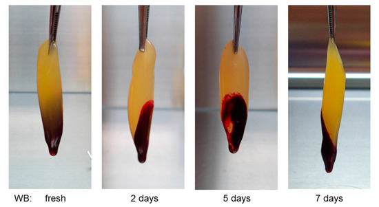 Figure 5. Visual appearance of platelet-rich fibrin–like matrixs (PRFMs) prepared from WB samples stored for the indicated periods. WB samples were simultaneously collected from the same donor. Similar PRFM samples were obtained from three other experiments.