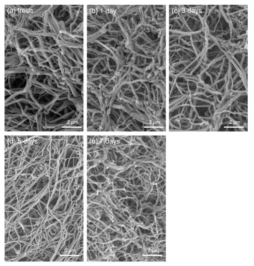 Figure 6. Scanning electron microscopy (SEM) images of fibrin fibers formed in PRFMs prepared from WB samples stored for the indicated periods. WB samples were simultaneously collected from the same donor. Similar findings were obtained in three other experiments.