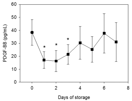 Figure 7. Time-dependent changes in the concentration of PDGF-BB extracted from PRFM samples that were prepared from stored WB samples and compressed to squeeze out PRFM exudates. * p < 0.05 as compared with fresh WB samples as controls (n = 8).