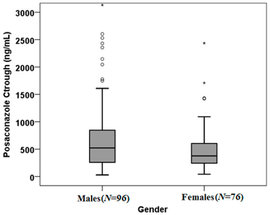 Evaluating those receiving PSC treatment based on published PSC through levels cut-offs [21,22,23], we observed that 84 patients (80.8%) showed sub-optimal exposure (drug concentrations <1000 ng/mL), 18 (17.3%) had concentrations higher than the efficacy cut-off (drug concentrations ≥1000 ng/mL) and 2 (1.9%) had toxic drug levels (drug concentrations ≥3500 ng/mL). Instead, for prophylaxis, 50 patients (61.7%) showed trough levels lower than the efficacy cut-off (drug concentrations <700 ng/mL), 30 (37%) had concentrations included in the efficacy range (drug concentrations ≥700 ng/mL) and 1 (1.2%) had drug levels higher than the toxicity cut-off levels (drug concentrations ≥3500 ng/mL). A high interindividual variability was found between PSC Ctrough: the median value was 419.50 ng/mL and the IQR range was 252.50 and 778.75. Mann-Whitney U test showed a significant influence of gender on drug exposure (p = 0.028): males (N = 96) had 521.50 ng/mL (IQR: 256.00–240.25 ng/mL) median concentrations, while females (N = 76) had 376.50 ng/mL (IQR: 240.25–376.50 ng/mL) (Figure 1).