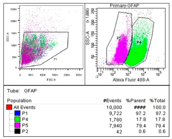 Glial fibrillary acidic protein (GFAP) immunophenotyping to determine the purity of astrocyte culture. Cultures were stained with GFAP antibodies tagged with FITC (Fluorescein Isothiocyanate) and analyzed on a flow cytometer. P1 shows the population of cells; P2 shows the debris cells which are located in the lower left-hand side of scatter plots; P4 shows the primary astrocyte cells; P5 shows the contaminated cells. The plot shows that 79.4% of cells in the culture are GFAP+.