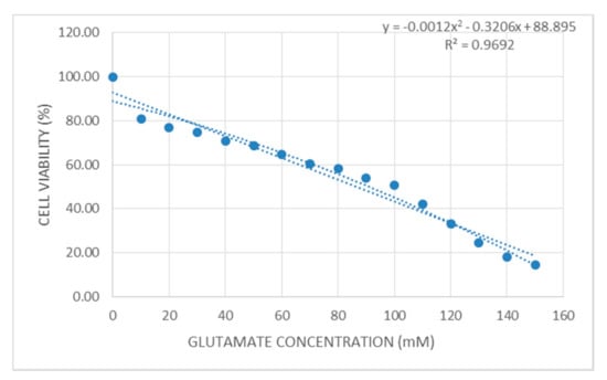 Through the dose-response curve (Figure 2), the half maximal inhibitory concentration (IC50) of glutamate for primary astrocyte cells was determined (the concentration that inhibits 50% of the cell population). It was expected that the cell viability would drop significantly on exposure to high concentrations of glutamate. The current observation illustrates that 100 mM of glutamate is required to cause the death of 50% of primary astrocytes. This observation is similar to that of a study on SH-SY5Y neuronal cells (a subclone of SK-N-SH neuronal cells), against glutamate challenge for hours []. Previous observation showed that the exposure of CRL-2020 astrocyte cells to 180 mM glutamate reduced cell viability by more than 50% in 24 h []. This shows that primary astrocytes do not have the capability to survive in an environment with a higher concentration of glutamate. The observation proposes an excessive level of glutamate-induced cellular impairment in primary astrocytes.
