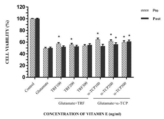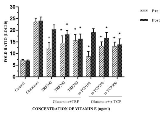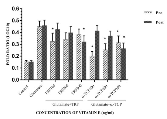 The effect of pre- and post-treatment with TRF and α-TCP against 100 mM glutamate on cell viability in astrocytes. Data represent the mean ± SEM of three independent experiments (n = 3 in each experiment). * p < 0.05, TRF- and α-TCP-treated groups compared with the glutamate-treated group. This shows that TRF and α-TCP, at a low concentration (100 ng/mL) in pre-incubation, and at a high concentration (300 ng/mL) in post-incubation, exerted potential prophylactic effects against glutamate toxicity in the primary astrocyte.