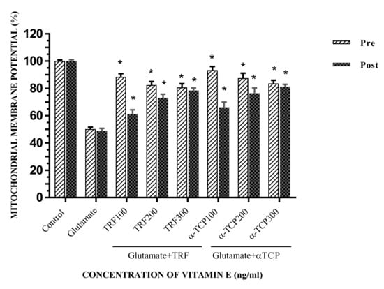 The effect of pre- and post-treatment with TRF and α-TCP on glutamate-injured astrocytes with respect to mitochondrial membrane potentiality. Data represent the mean ± SEM of three independent experiments (n = 3 in each experiment). * p < 0.05, TRF- and α-TCP-treated groups compared with the glutamate-treated group. This shows that TRF and α-TCP, at a low concentration (100 ng) in pre-incubation, and at a high concentration (300 ng) in post-incubation, demonstrated better prophylactic properties against the toxicity of glutamate in primary astrocytes.
