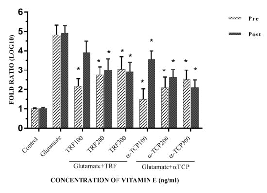Primary astrocyte cells were supplemented with 100–300 ng/mL of TRF and α-TCP before and after glutamate injury. The MTT assay revealed that 100 ng/mL TRF and α-TCP pre-treatment resulted in the highest cell viability. In the post-treatment study, cell viability was highest following treatment with 300 ng/mL TRF and α-TCP. Pre-treatment also increased cell viability significantly compared to the positive control (p < 0.05). This suggests that micromolar concentrations of TRF and α-TCP are sufficient for protection against neurodegeneration. This is similar to the findings in a previous study [,,]. Supplementing the cells with 100–300 ng/mL TRF/α-TCP increased cell viability after 24 h of incubation. A study by Osakada [] showed that, at a concentration of 1–10 μM, α-TCP protects striatal neurons against cytotoxicity induced by l-buthionine-S,R-sulfoximine (BSO) via the reduction of oxidative stress. This isomer also has the highest bioavailability of α-TCP, compared to the other isomers, due to recognition by the α-TCP transfer protein (α-TTP) []. The results thus suggest that vitamin E is effective in aiding astrocyte cell survival following glutamate toxicity.