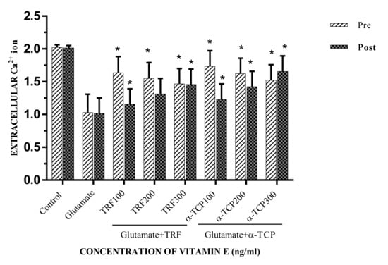 The results show that TRF and α-TCP can reduce the Ca2+ permeability in primary astrocytes by down regulating the iGluR genes. This finding demonstrates that TRF and α-TCP were able to reduce intracellular Ca2+ and Ca2+ influx during glutamate toxicity. In other words, extracellular Ca2+ increased when the cells were treated with 100–300 ng/mL TRF and α-TCP in comparison to the positive control (Figure 8). Hence, in the pre-treatment study, both TRF and α-TCP showed a considerably significant effect in reducing Ca2+ influx at 100 ng/mL. However, in the post-treatment study, both TRF and α-TCP had an effect on Ca2+ influx at 300 ng/mL in the astrocyte primary culture. Accordingly, synchronous with the decline of the Ca2+ influx, intracellular Na+ ions decreased with a rise in intracellular K+ concentration [].