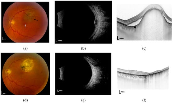 (a) Fundal photograph of left eye showing melanoma (black arrow) adjacent to the fovea (white arrow); (b) ultrasound of lesion in Figure 1a; (c) ocular coherence tomography (OCT) scan demonstrating sub-retinal fluid (black arrow); (d) post-treatment fundal photograph showing flat scar; (e) post-treatment ultrasound demonstrating flat scar; (f) post-treatment OCT showing resolution of sub-retinal fluid.