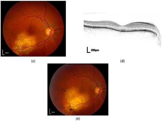 (a) pre-treatment fundal photograph of right eye demonstrating metastasis; (b) OCT scan demonstrating fluid beneath the fovea (black arrow); (c) post-PDT photograph showing regression of metastasis; (d) post-PDT OCT scan showing resolution of fluid; (e) fundal photograph showing recurrent tumour at edge of treatment scar (black arrow).