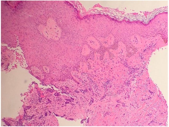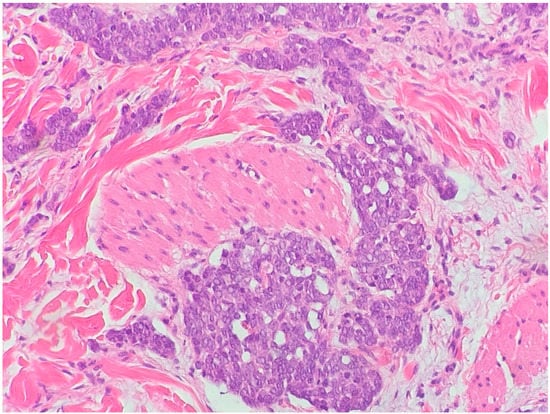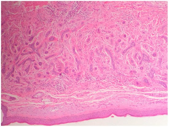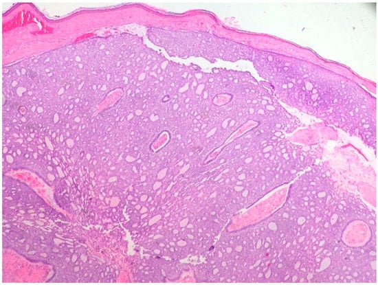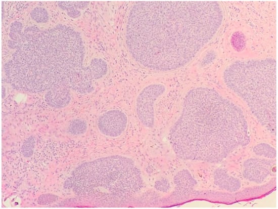 Micro-nodular BCC is characterized by a plaque-like shape, showing an increase incidence of recurrence []. Pathologically, it is similar to NBCC, but it is smaller and forms micro-nodules of basaloid cells, approximately the size of the hair bulbs, with minimal palisading [,]. The surrounding stroma is myxoid [].