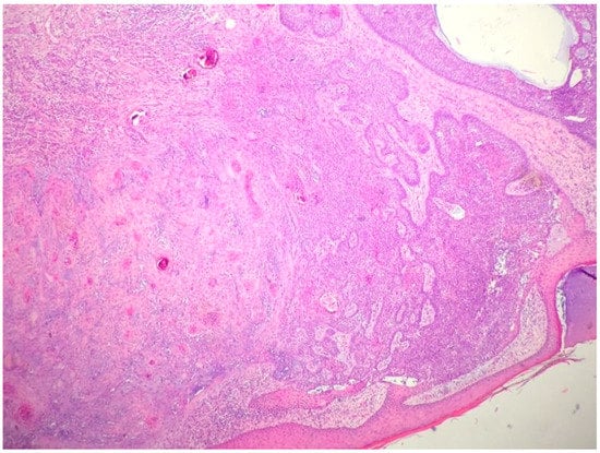 Metatypical carcinoma (BCC with squamous differentiation) is a BCC with features of nodular BCC and SCC []. This variant is characterized by basaloid cells with variable eosinophilic features, prominent mitotic activity, and numerous apoptotic cells [,] (Figure 3). Peripheral palisading is not always present. Metatypical carcinoma is one of the most aggressive subtypes, with a higher incidence of peri-neural and lymphatic spread [,,]. Contrariwise, the term baso-squamous carcinoma should be used in the case of tumors with contiguous areas of BCC and SCC [] (Figure 4). In this case, the typical features of both tumors are present [].