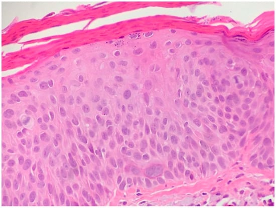 Actinic keratosis (AK) can be considered as an early SCC, rather than a pre-malignant lesion [,]. AK could potentially evolve into invasive tumor [,,]. Pathologically, AK is characterized by a horizontal alteration of parakeratotic and orthokeratotic hyperkeratosis, with an atrophic or acanthotic epidermis (Figure 7) []. Neoplastic keratinocytes in the basal layer show increased cellularity, nuclear pleomorphism, and scattered mitoses []. A superficial lichenoid or perivascular lymphocytic infiltrate is often associated with plasma cells []. In the papillary dermis, elastosis is often present []. The main histologic variants of AK are the acantholitic and the pigmented ones. Acantholitic AK is characterized by hyperkeratosis, acanthosis, and suprabasal acantholysis characterized by atypical basal keratinocytes. Acantholytic AK can be misdiagnosed for other acantholytic diseases as Grover disease, Darier disease, warty dyskeratoma, as well as seborrheic keratosis with acantholysis. Pigmented AK is characterized by melanin pigment in the keratinocytes and melanophages; specifically, the melanin is focally increased in basal keratinocytes. However, a slight melanocytic proliferation may be present [,]. The main differential diagnosis are Bowen’s disease (atypia of keratinocytes at every layer of the epidermis) and flat seborrheic keratosis, that is characterized by acanthosis and papillomatosis with sharp usually flat base and distinct lateral margins, intraepithelial horn pseudo-cysts, and monotonous basaloid tumor cells without atypia [].