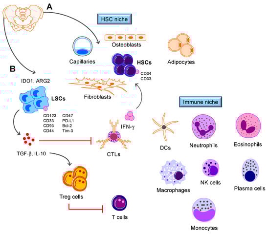 The immune landscape of normal (A) and leukemic (B) BM. The BM microenvironment hosts a variety of immune cell types, including T cells, B cells, plasma cells, dendritic cells, neutrophils, macrophages, eosinophils and regulatory T cells. Immune cells support steady-state and emergency hematopoiesis, provide an immune privileged niche that protects HSCs from immune destruction and contribute to leukemia control. Candidate leukemia stem cell markers, including CD123 [5], CD44 [6], Bcl-2 [7] and Tim-3 [8], as well as markers of normal hematopoietic stem cells are shown. Microenvironmental soluble factors, such as interferon (IFN)-γ produced by cytotoxic T cells, might promote leukemia cell proliferation [9]. IDO1 = Indoleamine 2,3-dioxygenase-1; ARG2 = arginase-2; LSC = leukemia stem cell; HSC = hematopoietic stem cell; DC = dendritic cell; CTL = cytotoxic T lymphocyte. Red lines denote feedback inhibition.