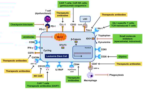 - Majeti, R. Monoclonal antibody therapy directed against human acute myeloid leukemia stem cells. Oncogene 2011, 30, 1009–1019. [Google Scholar] [CrossRef] [PubMed]