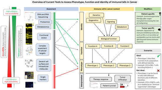 Overview of current tools to assess phenotype, function, and identity of immune cells in cancer. Multiple tools that differ in their accessibility, feasibility and relevance are available to study immune cells that infiltrate human tumors or are found in the periphery. Techniques such as genome or transcriptome sequencing provide deep insights into the identity, function and phenotype of studied targets, they are however technically and logistically challenging and often an inadequate data analysis and interpretation prevent a high information yield. On the contrary, low-dimensional assays (e.g., immunohistochemistry or low-parameter flow cytometry) are broadly accessible, while insufficient to capture the biological complexity. In addition, immune cells in the cancer environment are highly heterogeneous and often no linear relationship between cellular identities, function and phenotype exist due to cellular plasticity and context (e.g., tissue) specificities. Data from [2,3] were used to prepare this figure.