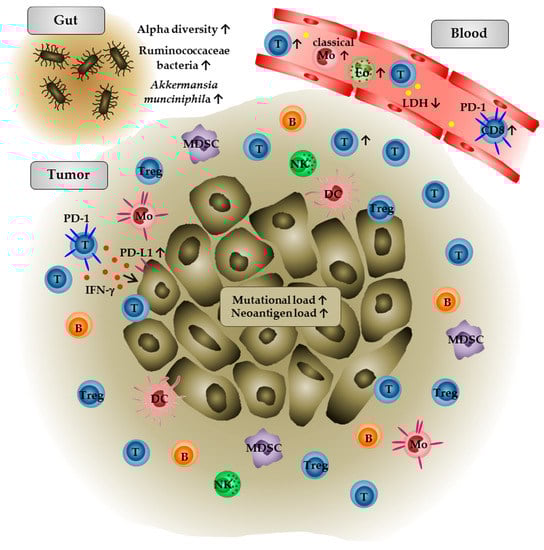 Immunological characteristics in anti-PD-1/PD-L1 antibody-treated tumor patients that are associated with clinical outcome. In peripheral blood, higher numbers of eosinophils, lymphocytes, PD-1+ CD8 T cells, and classical monocytes as well as low levels of LDH are associated with improved clinical responses. Within the tumor, higher densities of CD8+ T cells in pretreatment tumor samples and an increase in intratumoral CD8+ T cell frequencies during anti-PD-1 therapy are detectable in patients that show a clinical response. Further studies indicate that a high PD-L1 expression on tumor cells and infiltrating immune cells as well as a high intratumoral mutational and neoantigen load are correlated with an improved survival of patients. In addition, a significantly higher alpha diversity or a relative abundance of Ruminococcaceae bacteria and Akkermansia munciniphila in the gut microbiome are associated with favorable clinical outcome of tumor patients.