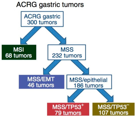 Complementary to the TCGA data, the ACRG proposed a classification of GC that correlates four molecular subtypes with distinct patterns of molecular alterations, disease progression and prognosis. The molecular analyses include principal component analysis (PCA) [49] of expression data and compared the association of the first three principal components with a small pre-defined set of gene expression signatures relevant to biology of GC. These include epithelial-to-mesenchymal transition (EMT) [50], microsatellite instability (MSI) [51], cytokine signaling [52], cell proliferation [53], DNA methylation [54], p53 activity [55], and gastric tissue [56]. Of the 300 specimens of GC being analyzed, the MSI subtype accounts for 23%, MSS/EMT 20%, MSS/TP53+ (mutated) 26%, and MSS/TP53− (wild-type) 36% (Figure 2). TP53 is the most frequently mutated gene in GC, and the status of p53 activation is based on a two-gene (CDKN1A and MDM2) p53-activity signature.