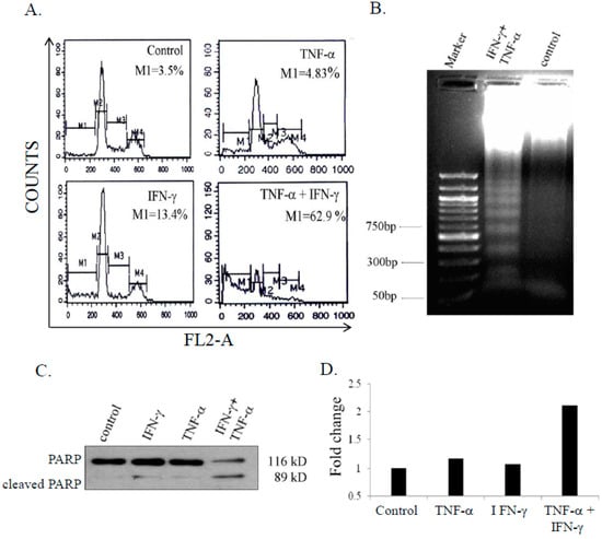 Tumor necrosis factor-alpha (TNF-α) is a pleiotropic cytokine with multifaceted functions. In vitro and in vivo studies have demonstrated strong anti-tumor activity of TNF-α in different types of cancers [4,5,6]. TNF-α has been exploited for potentiation of cytotoxicity induced by chemotherapeutic drugs. Interferon-gamma (IFN-γ) is a pro-inflammatory cytokine belonging to the type II class of interferons. The biological activity of IFN-γ as an anticancer agent is attributed to inhibition of proliferation, induction, and modulation of gene expression mediated by activation of Janus Kinase/Signal Transducer and Activator of Transcription (JAK/STAT) signaling pathway. Several earlier studies have demonstrated the effectiveness of the combination of IFN-γ and TNF-α in inducing apoptosis and necrosis in cancer cells [7,8,9,10,11,12]. However, the mechanisms underlying the combined effect of these cytokines are not clearly understood.