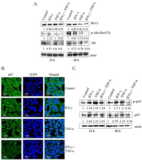 Down-regulation of anti-apoptotic proteins in SK-N-MC cells treated with the combination of IFN-γ and TNF-α. (A) SK-N-MC cells were treated with IFN-γ (10 ng/mL) and TNF-α (20 ng/mL) alone and in combination for 24 h and 48 h. Lysates were subjected to SDS-PAGE, followed by western blot analysis with the antibodies indicated; (B) SK-N-MC cells grown on glass cover slips were exposed to IFN-γ (10 ng/mL) and TNF-α (20 ng/mL) and in combination for 48 h, and analyzed for the localization NF-κB/p65 by immunofluorescence (Bar = 20 μm); and (C) immunoblotting analysis. Bcl-2: B-cell lymphoma-2; Ak mouse strain thymoma: Akt.