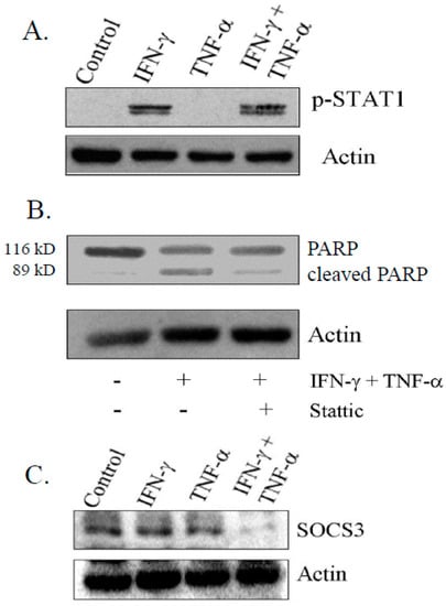 Activation of Signal Transducer and Activator of Transcription-1 (STAT1) on phosphorylation by IFN-γ alone and in combination with TNF-α. (A) Activation of phospho-STAT1 (Try-701) in IFN-γ and in combination with TNF-α by immunoblotting; (B) Decrease in total PARP in cells treated with STAT1 inhibitor (Stattic) at 2.5 µg/mL; and (C) Expression of suppressor of cytokine signaling-3 (SOCS3) on combination treatment for 48 h determined by immunoblotting. −: untreated; +: treated.
