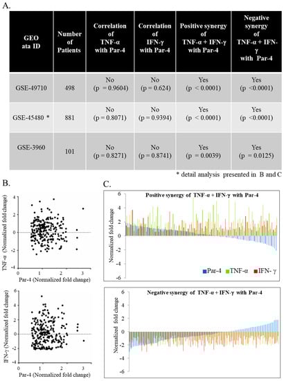 Correlative gene-expression profile of IFN-γ and TNF-α in relation with Par-4 of human neuroblastoma datasets. Three datasets from neuroblastoma patients were obtained from gene expression omnibus (GEO) database (A) We evaluated the individual correlation between Par-4 with IFN-γ or TNF-α and significance value described for one dataset; (B) positive (upper panel; also upper panel in (C)); and negative (lower panel; also lower panel in (C)) synergies were determined in the datasets by determining the correlation between differentially regulated Par-4 with IFN-γ and TNF-α together. GSE: GEO accession number; *: detail analysis presented in (B,C).