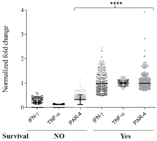 Expression levels of IFN-γ, TNF-α, and PAR-4 in neuroblastoma patients and their survival. Normalized gene expression of IFN-γ, TNF-α, and PAR-4 were analyzed in patients with their survival outcome. Dunn’s Multiples comparison was used to determine significant differences between groups (**** p < 0.0001).