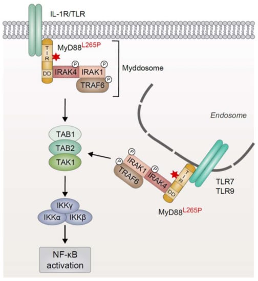 The aberrant activation of innate immune signaling cascades represents one mechanism to drive constitutive activation of NF-κB signaling in lymphoid malignancies [10]. B cells express TLRs which recognize a wide variety of pathogen-associated molecular patterns (PAMPs) derived from bacteria, viruses, or fungi independently of the B-cell receptor (BCR) [26]. Structurally, TLRs are characterized by a conserved Toll/IL-1 receptor (TIR) domain which undergoes a conformational change after receptor ligation, providing a platform for the interaction with cytoplasmic TIR domain-containing proteins, such as the adapter protein myeloid differentiation primary response protein 88 (MyD88) [27]. MyD88 comprises an N-terminal death domain which is connected to a C-terminal TIR domain by a linker region [28]. Ligand binding results in dimerization of the TLRs and subsequent recruitment of MyD88 homodimers via TIR–TIR interactions [29,30]. MyD88 forms a high-molecular weight signaling complex, the so-called Myddosome, through a series of sequential interactions (Figure 1): First, MyD88 oligomerizes and recruits the IL-1R-associated kinases 1, 2, and 4 (IRAK1, 2, and 4) via a homotypic interaction involving their death domain. In the Myddosome, IRAK4 is activated by auto-phosphorylation and in turn phosphorylates IRAK1 [28,31,32,33,34]. IRAK2 can functionally substitute IRAK1, implicating that IRAK1 and IRAK2 are redundant for downstream signaling [35]. Once IRAK1 is fully phosphorylated, it dissociates from the receptor complex and activates the E3 ubiquitin ligase TNF receptor-associated factor 6 (TRAF6). TRAF6-dependent lysine 63 (K63)-linked polyubiquitination of itself and several other proteins facilitates the recruitment of the IKK complex and TGFβ-activated kinase 1 (TAK1) via the ubiquitin binding domains of the regulatory subunit IKKγ and the adapter proteins TAK1-binding protein (TAB), respectively [36,37,38]. TAK1-dependent phosphorylation activates IKKβ which in turn induces the proteasomal degradation of the inhibitory protein IκBα, thus triggering canonical NF-κB activation [3,39].