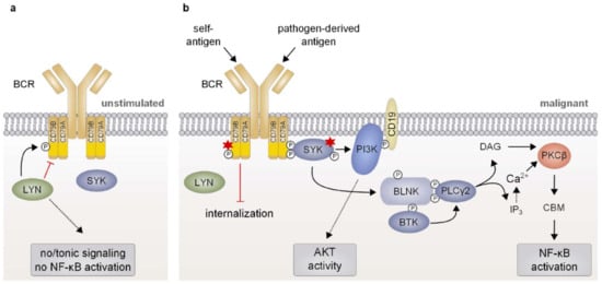 Due to its capacity to induce NF-κB activation, BCR signaling plays an important role in the survival and proliferation of a subset of B-cell malignancies [21,62]. Accordingly, it has been reported that chronic infections with viral and bacterial pathogens are often associated with lymphoma development due to persistent antigen-driven activation and proliferation of the B cells (Figure 2b) [63]. Several foreign antigens, for instance derived from hepatitis C virus, have been reported to be associated with certain types of lymphoma and most likely govern lymphoma proliferation and survival in a BCR-dependent manner [63,64]. In contrast, the ABC subtype of DLBCL seems to rely on chronic BCR signaling driven by self-antigens, since the survival of ABC DLBCL cell lines is impaired upon substitution of the IgH variable region of their BCRs [65]. Interestingly, the BCRs of some ABC DLBCL cell lines are reactive towards self-antigens present in apoptotic debris or towards an invariant part of its own V region [65]. The toxicity caused by knockdown of the essential BCR subunits CD79A/B or of downstream signaling effectors, such as BTK, SYK, and PLCγ2, observed in most ABC DLBCL cells further corroborates the notion that these lymphoid tumors critically rely on chronic active BCR signaling [66,67]. Conversely, the GCB subtype of DLBCL is independent of chronic BCR activation but instead requires “tonic”, antigen-independent BCR signals which promote survival by activating the PI3K/AKT pathway [66,68,69,70]. In line with chronic BCR triggering, cell lines as well as biopsies of ABC DLBCL typically exhibit BCR clustering on the cell surface, which correlates with increased levels of tyrosine phosphorylation and indicates sustained BCR signaling [67]. Chronic BCR signaling also plays a crucial role in CLL, since 30% of this cancer entity express a similarly rearranged BCR using a distinct subset of VH, DH, and JH gene segments, which can also be found in ABC DLBCL [65,71]. These so-called “stereotyped” BCRs are thought to respond to similar antigens, most likely presented by the tumor itself, such as proteins of apoptotic cells or an epitope of the BCR [72,73,74]. Interestingly, expression of a CLL-derived IgH V region has been shown to sustain the survival of an ABC DLBCL cell line, suggesting that a similar (self-) antigen is driving chronic BCR signaling in a subset of CLL and ABC DLBCL [65].