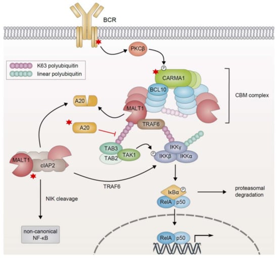 Another tumor entity critically relying on constitutive CBM signaling is represented by lymphomas of the mucosa-associated lymphoid tissue, which occur most commonly in the stomach typically due to chronic infection, e.g., with Helicobacter pylori, and can be successfully treated at early stages by eradication of the source of inflammation [134,141,142]. At advanced stages, however, these MALT lymphomas are associated with distinctive chromosomal translocations, which either lead to the overexpression of BCL10 and MALT1 [143,144,145] or result in the generation of a constitutively active fusion protein comprising the N-terminal part of cellular inhibitor of apoptosis protein 2 (cIAP2, also known as API2) and the C-terminus of MALT1 [24,146,147]. The cIAP2-MALT1 fusion protein is able to auto-oligomerize independently of BCL10 and upstream signals via the baculovirus inhibitor of apoptosis repeat (BIR) domain of the cIAP2 moiety which binds heterotypically to the C-terminal region of MALT1 (Figure 3) [134,148,149]. Constitutive MALT1 protease activity and the capacity of cIAP2-MALT1 to potently activate both the canonical NF-κB1 (via the MALT1-dependent recruitment of TRAF6 and proteolytic inactivation of A20) and non-canonical NF-κB2 pathways (discussed in Section 5) drive the growth of these MALT lymphomas [24,107,121,148,149].
