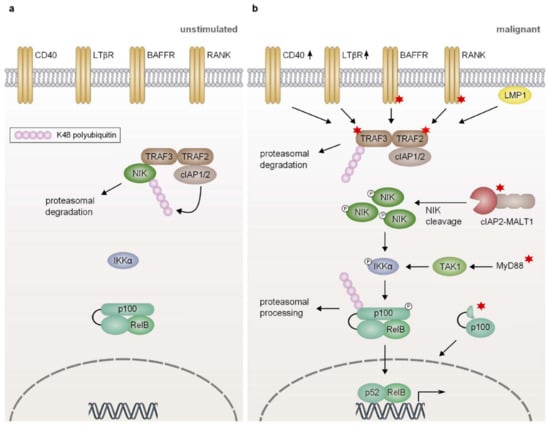 Genetic lesions driving non-canonical NF-κB activation in lymphoid malignancies. (a) In unstimulated cells, TRAF3 recruits NIK to an E3 ubiquitin ligase complex comprising TRAF2 and cIAP1/2 which constantly marks NIK for proteasomal degradation by K48-linked polyubiquitination. The heterodimer of RelB and the p52 precursor protein p100 is sequestered in the cytoplasm; (b) Activated or mutated members of the TNF receptor family, such as CD40, BAFF-R, LTβR, and RANK or the EBV-encoded CD40 mimic LMP1, recruit the complex consisting of TRAF3, TRAF2, and cIAP1/2 to the cell membrane and induce the proteasomal degradation of TRAF3. In the absence of TRAF3, NIK is released from the inhibitory E3 ubiquitin ligase complex and accumulates in the cytoplasm where it subsequently phosphorylates and activates IKKα. In turn, IKKα phosphorylates the precursor protein p100, thus targeting it for processing by the proteasome. Proteasomal processing of p100 generates p52 and results in the nuclear translocation of transcriptionally active p52/RelB heterodimers. Enhanced expression of NIK due to copy number gains and loss-of-function mutations of TRAF2, TRAF3, or cIAP2 result in increased NIK protein levels driving non-canonical activation of NF-κB in lymphoid malignancies. Similarly, proteolytic cleavage by the constitutively active cIAP2-MALT1 fusion protein stabilizes NIK by removal of the TRAF3-binding site. Additionally, oncogenic MyD88 mutations can promote the activation of IKKα in a TAK1-dependent manner. In certain lymphomas aberrant activation of non-canonical NF-κB is governed by the expression of a truncated, constitutively active version of the precursor p100 lacking the inhibitory ankyrin repeats. Proteins that are affected by recurrent genetic lesions in lymphoid malignancies are denoted with a red asterisk. BAFF-R, B cell-activating factor receptor; cIAP1/2, cellular inhibitor of apoptosis protein 1/2; EBV, Epstein-Barr virus; IKKα, IκB kinase α; LMP1, latent membrane protein 1; LTβR, lymphotoxin β receptor; MALT1, mucosa-associated tissue lymphoma translocation protein 1; MyD88, myeloid differentiation primary response protein 88; NIK, NF-κB inducing kinase; RANK, receptor activator of NF-κB; TAK1, TGFβ-activated kinase 1; TRAF2/3, TNF receptor-associated factor 2/3.