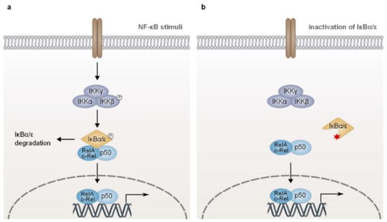 In non-activated cells, NF-κB dimers are sequestered in the cytoplasm by an interaction with classical IκB proteins (IκBα, IκBβ, and IκBε), which mask the nuclear localization signal (NLS) of the NF-κB subunits and thus prevent their nuclear translocation (Figure 5a). Stimulation-dependent proteasomal degradation of the IκB proteins allows the translocation of the NF-κB dimers to the nucleus, where they modulate the expression of a variety of genes [2,3]. The best characterized classical IκB protein, IκBα, is composed of a signal response domain, ankyrin repeats, a PEST domain as well as a nuclear export signal (NES) and binds preferentially RelA/p50 heterodimers. The presence of an NES suggests that besides its function as a cytoplasmic inhibitor, IκBα is also involved in the termination of NF-κB transcriptional activity by promoting both the dissociation of RelA/p50 complexes from the DNA and their subsequent nuclear export [3,190,191,192].