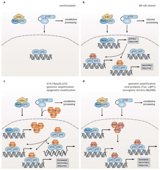 Abnormal expression of the atypical IκB proteins BCL3 and IκBζ promotes NF-κB activation in lymphoid malignancies. (a) In resting cells, DNA-bound homodimers of the NF-κB subunit p50 can be found in the nucleus due to constitutive processing of the p50 precursor p105; (b) Upon B-cell stimulation, the activated IKK complex induces both the generation of p50 by proteasomal processing of its precursor p105 and the proteasomal degradation of the inhibitor IκBα. This leads to the nuclear translocation of RelA/p50 heterodimers which drive the transcription of primary response genes, such as BCL3 and NFKBIZ. In turn, BCL3 and IκBζ modulate the secondary NF-κB response by binding to DNA-bound p50 homodimers in the nucleus; (c) The chromosomal translocation t(14;18)(q32;q13) juxtaposing BCL3 with the IGH locus, genomic amplifications, or epigenetic modifications result in enhanced expression of BCL3, which in turn increases the nuclear translocation of p50 and stabilizes DNA-bound p50 homodimers, thus augmenting the secondary NF-κB response; (d) Genomic amplification of the NFKBIZ locus as well as the expression of oncogenic MyD88L265P or the viral proteins Tax and LMP1 leads to increased expression of IκBζ in a subset of lymphoid tumors. IκBζ promotes the secondary NF-κB response through binding to p50 homodimers in the nucleus. BCL3, B-cell lymphoma 3; IGH, immunoglobulin heavy chain (locus); IκB, inhibitor of κB; IKK, IκB kinase; LMP1, latent membrane protein 1; MyD88, myeloid differentiation primary response protein 88.