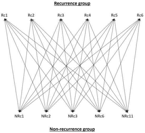 RNA-Seq was performed on liver grafts from recipients with (n = 6) or without (n = 5) post-transplant HCC recurrence. The 5 patients without post-transplant HCC recurrence are patients treated with deceased donor liver transplant (DDLT). Total RNA was extracted from liver grafts using TRIzol reagent (Life Technologies, Waltham, MA, USA) as before [9,10]. RNA quality was analyzed in an Agilent 2100 Bioanalyzer (Agilent Technologies, Santa Clara, CA, USA). RNA sequencing was performed in a HiSeq 2500 System sequencer (Illumina, San Diego, CA, USA) in BGI, Hong Kong. A total of eight billion bases of sequencing data (quality control passed) was produced. The data were preprocessed using cutadapt version 1.1 to remove sequencing adapters. Then the data were mapped to the human reference genome GRCh37 (hg19) using aligner BWA version 0.6.2 with default options and then converted into BAM file format using SAMtools version 0.1.19. The gene expression level of each sample was calculated using the method introduced by Mortazavi et al. [11]. More specifically, the gene expression level difference between any given two samples was gauged by the number of sequencing data mapped to the gene, RPKM (reads per kilobase per million mapped reads). Each recurrence sample was compared to each non-recurrence sample to identify the up-regulated and down-regulated genes (Figure 1), together with their expression ratios. Using this method, a total of 30 differentially expressed gene lists were generated, which were then merged. Genes with inconsistent expression changes were removed. An average expression difference for each gene was calculated.