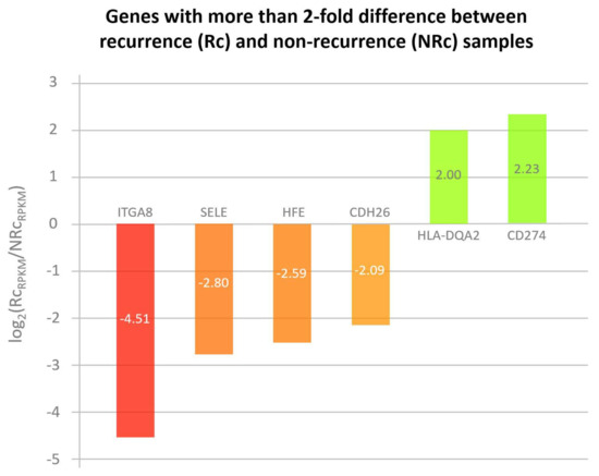 RNA-Seq result shows cell adhesion molecules that had more than two-fold gene expression level difference between recurrence and non-recurrence samples in acutely injured liver grafts. Six cell adhesion molecules with intragraft gene expression level difference of more than two-fold when recurrence samples were compared to non-recurrence ones. Four molecules (ITGA8, SELE, HFE, and CDH26) have been down-regulated in recurrence samples, whereas two molecules (HLA-DQA2 and CD274) were found to have been up-regulated.