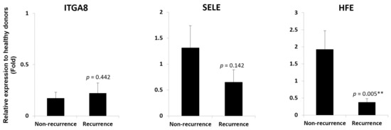 Cell adhesion molecules represent a broad class of membrane-associated molecules with diversified functions in pathophysiological processes, ranging from cell adhesion, inflammation, tissue injury, to tumorigenesis. In this category, seventy-five genes were differentially expressed in liver grafts in the recurrence group compared to the non-recurrence group (Supplementary Table S5), implicating their involvement in post-transplant HCC recurrence. Six genes with more than two-fold expression level difference between these two groups, i.e., ITGA8, SELE, HFE, CDH26, HLA-DQA2, and CD274 (Figure 2 and highlighted in Supplementary Table S5), were subjected to RT-qPCR validation in a sample set of seven recurrences and seven non-recurrences. Among the four genes down-regulated in recurrence samples (ITGA8, SELE, HFE, and CDH26), only HFE maintained its down-regulation (Figure 3). The CDH26 validation result was not shown due to its nearly undetectable expression level in our current experimental setting. For the two genes up-regulated in recurrence samples (HLA-DQA2 and CD274), an up-regulation of CD274 was maintained (Figure 4). No validation experiment was performed on HLA-DQA2 due to its ubiquitous nature.