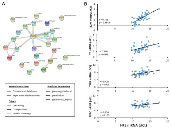 Correlation analysis of HFE and its related molecules in liver grafts from transplant recipients. (A) Bioinformatics analysis revealed B2M, TF, TFR2 and TFRC as HFE-related molecules; (B) Among these molecules, B2M, TF and TFR2, but not TFRC, demonstrated a positive gene expression correlation with HFE in liver grafts from 43 transplant recipients using RT-qPCR.